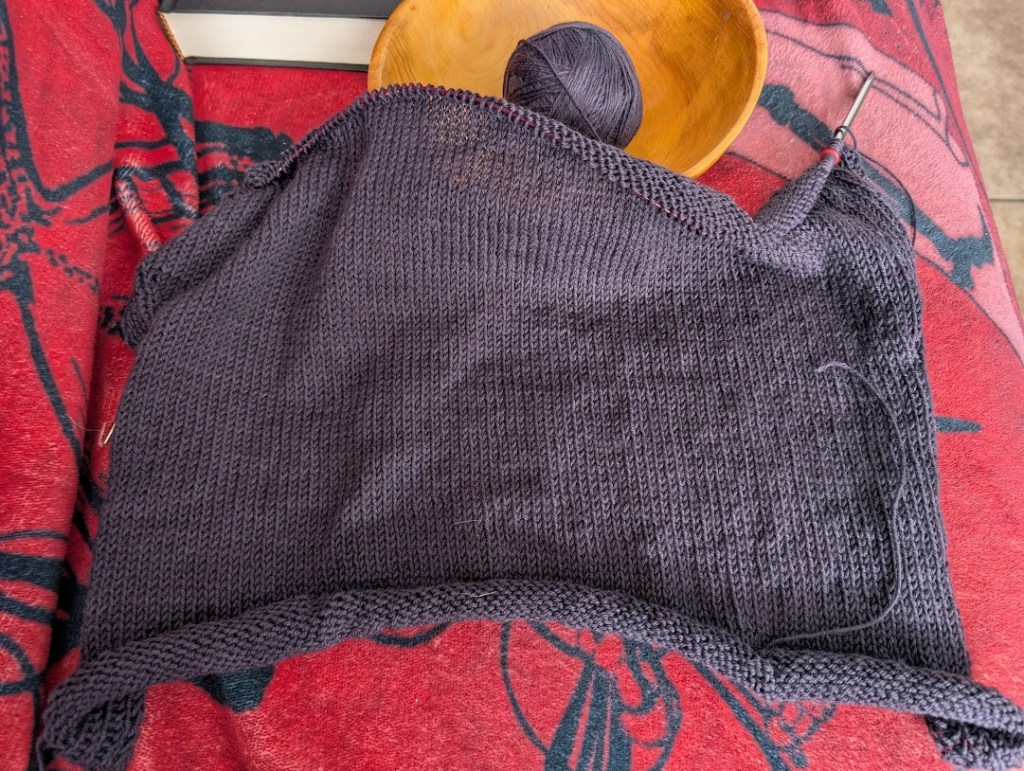 As usual, my phone has dialed up the brightness on my knitting by a million percent, making the color look a lot lighter than it really is. Next time maybe I’ll borrow my kid’s camera and see if that captures the color better.