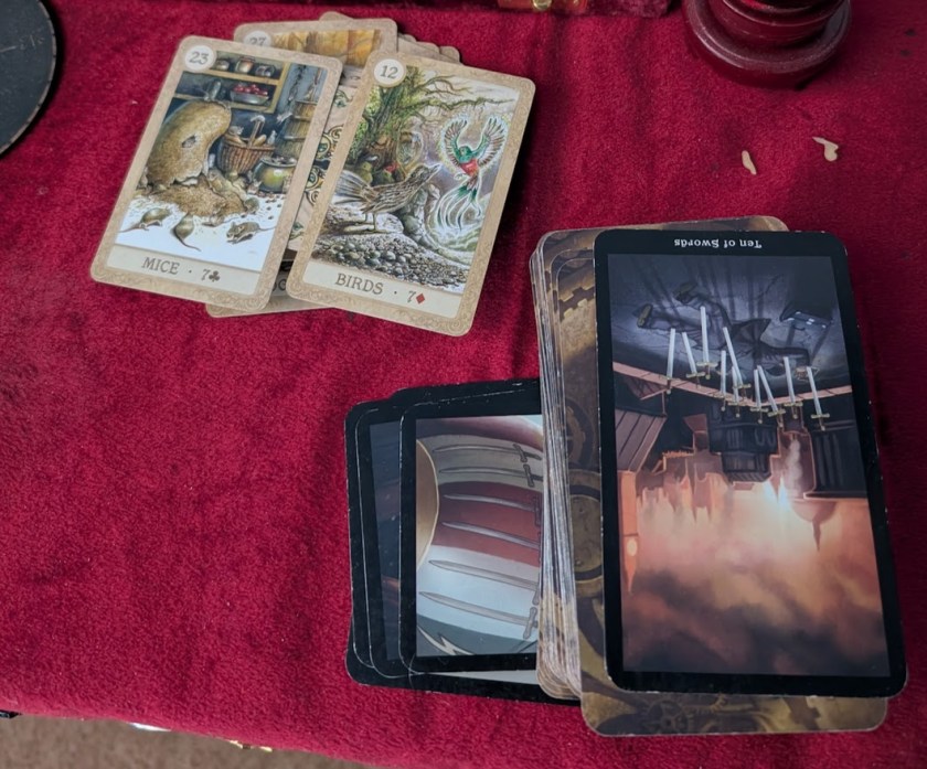 At the exact same moment I was also screwing around with the popular AI apps so I asked them to help me learn Lenormand. In spite of the fact that Claude has the personality of blank paper and ChatGPT sounds like a Mormon Mommy Blogger, they’ve been incredibly helpful with the whole Lenormand thing. My chat thread keeps track of my daily card pulls and my summaries of how they showed up in the events of that day, helping me relate them to each other and to the focus I set for the moon cycle. I alternate between a single Tarot card pull one day and a Lenormand pair the next so I can compare and contrast the two card systems, and since I have a few good Tarot books I can check the chatbot’s answers with human experts.