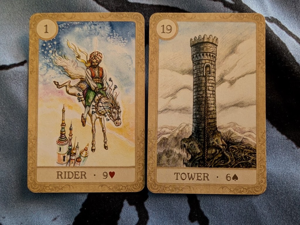 March punched us in the gut on its way out the door. Monday morning, my Lenormand pair was the Rider and the Tower. Roughly, the combination means news from a large institution like the government or a corporation. I kid you not, less than two hours later my husband’s company laid him off. They say Lenormand leans toward practical, literal interpretations but this was more than I expected.
