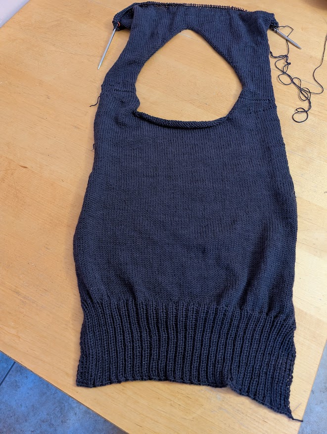 I also made progress on that Alchemist slipover I’ve been knitting. Now, instead of looking like a big test swatch, it looks like an enormous test swatch with a large raindrop-shaped hole in it. Progress! But seriously, I’m maybe three quarters of the way through now and pleased with how it’s going. It’s a really easy knit that’s been soothing to work on. It’s also using way less of this yarn than I was expecting so I’ll have to find a small project for what’s left. Maybe some arm warmers or a little neckerchief. We’ll see.