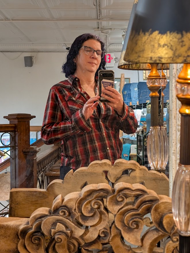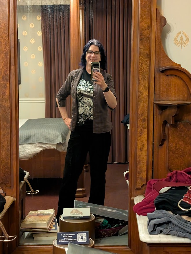 My assortment of photos also features the only two western shirts I own. It was the closest I could get to a proper bluegrass outfit. I’m middle-aged and lazy and don’t look all that alternative, but in this crowd I was very much on the young side and the staff seemed just the slightest bit confused by my dark purple hair and spider bites. They were all polite, though, and none of the actual audience seemed concerned.