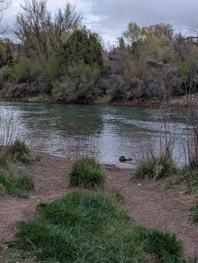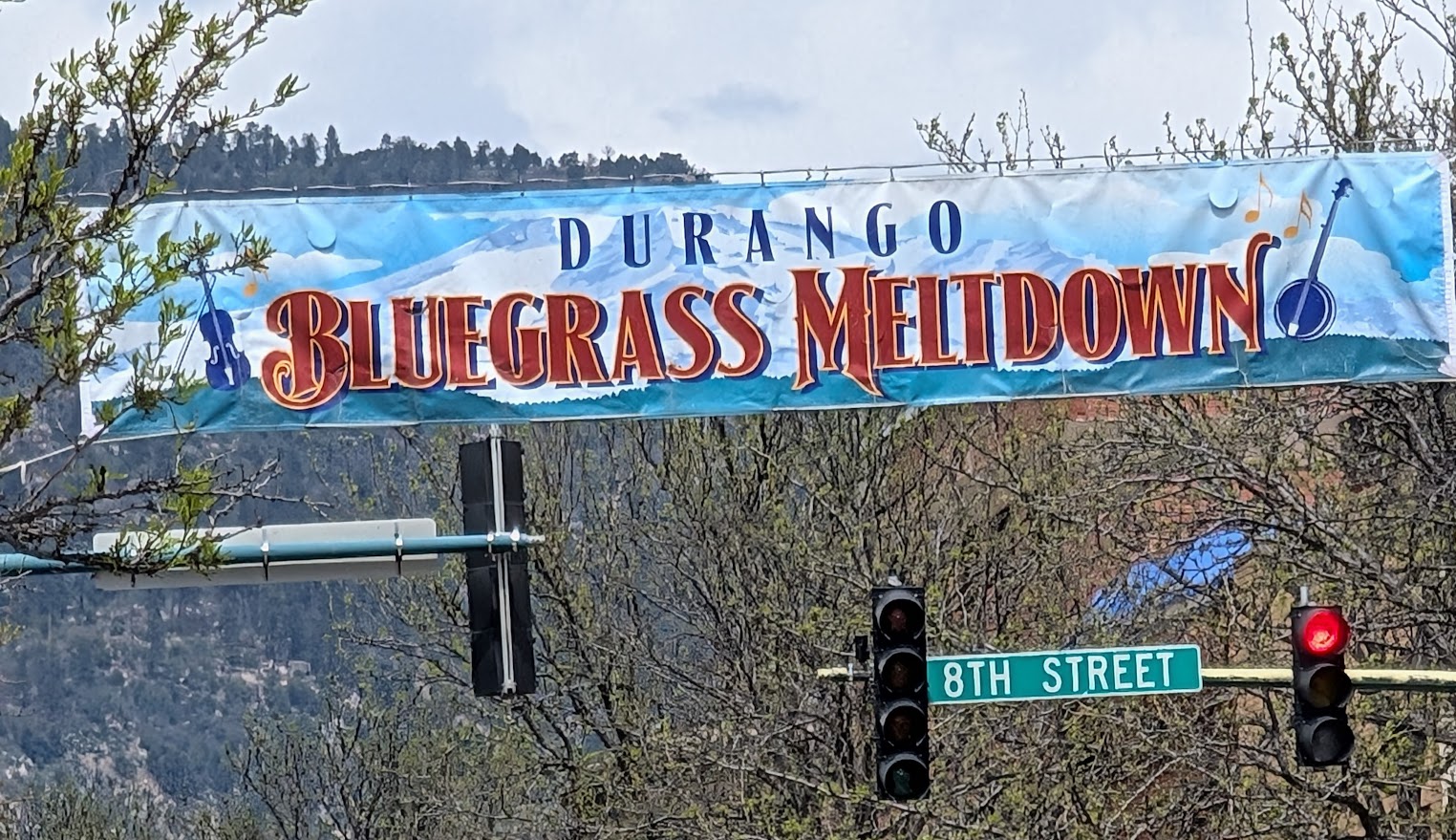 I missed writing last Sunday because I was out of town. Last weekend was my Dude’s birthday; I took him to the Bluegrass Meltdown in Durango, Colorado. Durango is a lovely little place to spend a couple days. It’s got a cute little historical district packed with nice restaurants and shops to explore (including at least four bookstores we browsed through), and an easy path beside the Animas river only a few blocks farther along. We were able to park behind our hotel and walk anywhere we wanted all weekend.