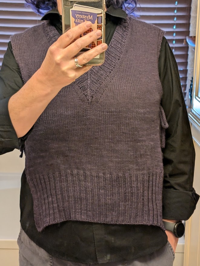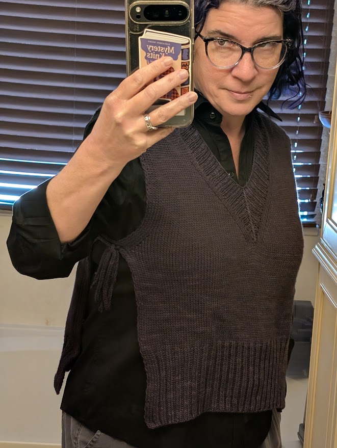 Anyway, after our fun weekend trip, it was back to reality and back to frugality while my husband continues his job search. We had some repairs done in our garage that were mercifully cheap. We played board games with friends. I finished that Alchemist slipover I was working on. I was too busy to take nice outdoor photos but I did pose in front of the bathroom mirror for you. The darkest picture is closest to what the color looks like in person but my phone washes out the color trying to catch the detail. I am good at many things but photography isn’t one of them.